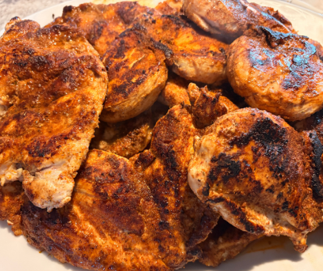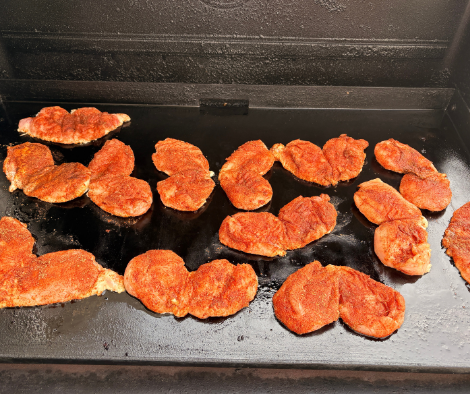 I rubbed the seasoning on the chicken breasts and put them on our pre-heated Blackstone that I had lightly coated with canola oil.
