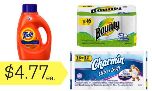 Plus, head to CVS this week and use your new coupons to get Bounty paper towels, Charmin bath tissue and Tide detergent for $4.77 each!