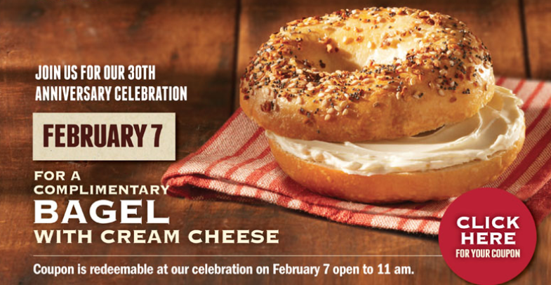 Bruegger’s Bagels has been open for 30 years and they are celebrating. On 2/7 you can take in this printable coupon for a Free Bagel with Cream Cheese!