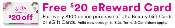 Today only, hurry to Ulta.com where you can score a FREE $20 bonus card when you buy a $100 gift or eGift card.