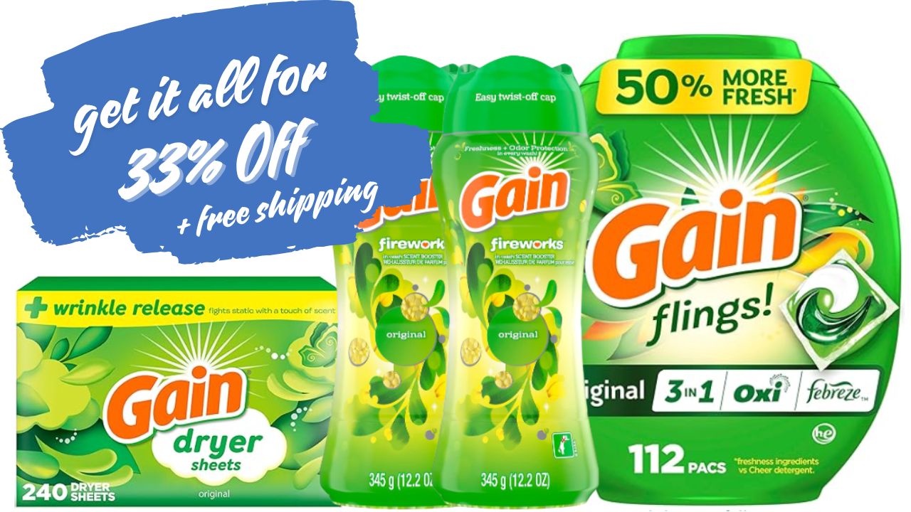 Stock up on Gain Laundry Products at Amazon! Get 33% off when you buy one detergent and three fabric enhancers like fabric softener and dryer sheets!