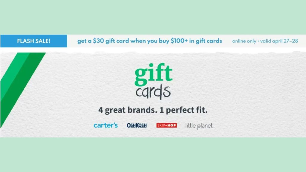Hurry over to Carter’s today to earn a $30 gift card when you spend $100+ on gift cards online. Gift cards are valid at Carter’s, OshKosh, SkipHop and Little Planet.
