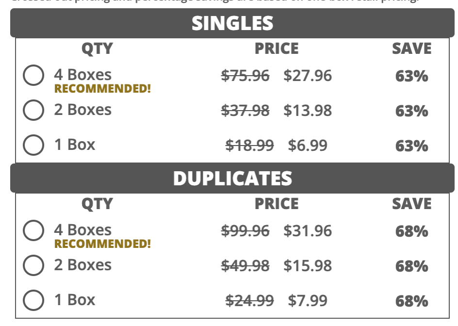 I went with 4 boxes of duplicates and they shipped for $23.22 after tax. That makes it $5.80 per box of duplicates shipped!