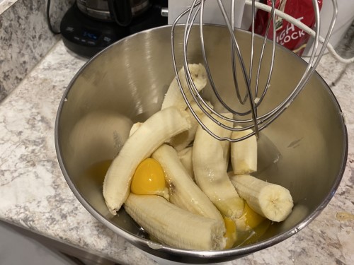 Put all the wet ingredients into the bowl of your stand mixer—bananas, sugar, butter, eggs, vanilla, and milk.