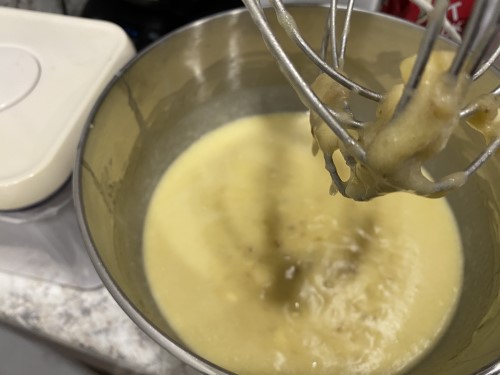 - Put all the wet ingredients into the bowl of your stand mixer—bananas, sugar, butter, eggs, vanilla, and milk. Mix until it’s all combined, although you may see chunks of bananas. If needed, you can use a potato masher to get out all of the bigger clumps.