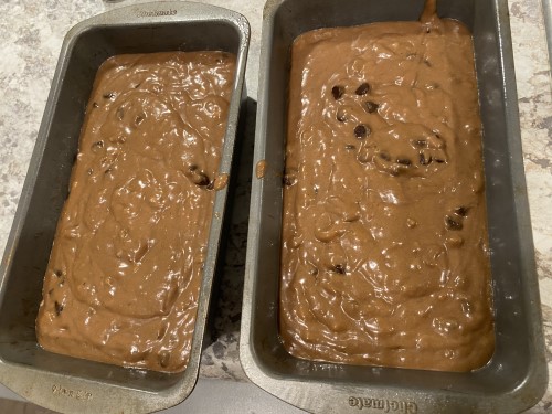 - Spray two loaf pans with cooking spray and divide the batter evenly between them.