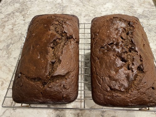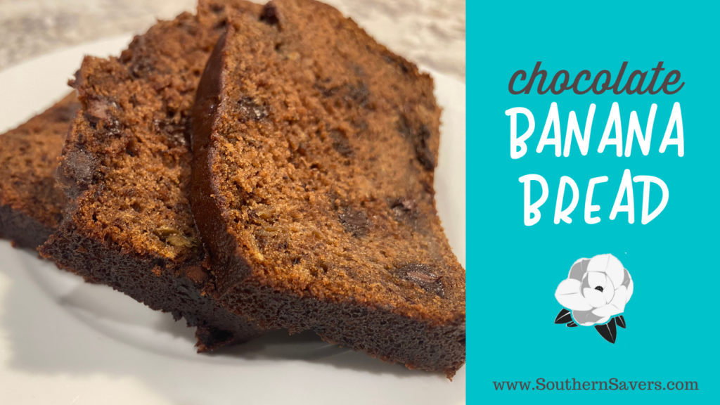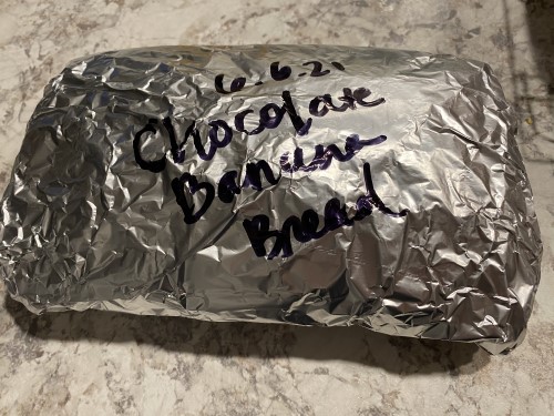 The other great thing about this chocolate banana bread recipe is that it makes two! I usually keep one for our family for snacks and breakfasts for the next day or two, and I freeze the other one.