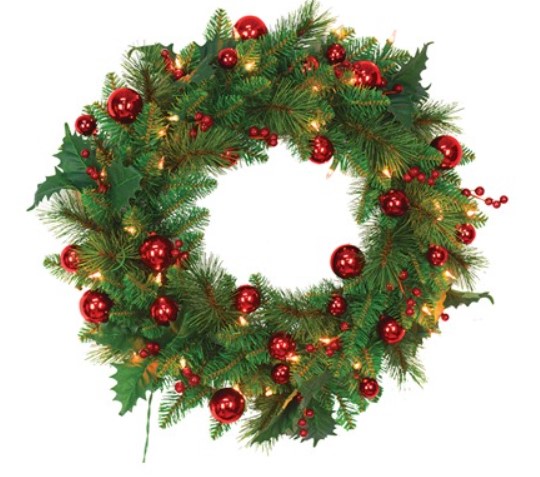 24″ Wreath with Red Balls & Berries, Lights – $36 (reg. $98)