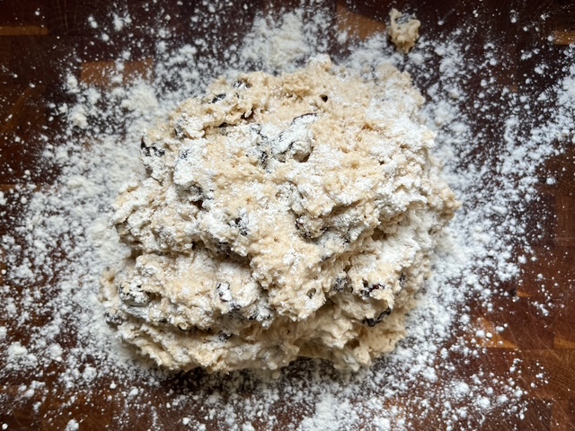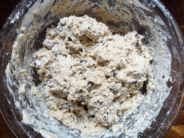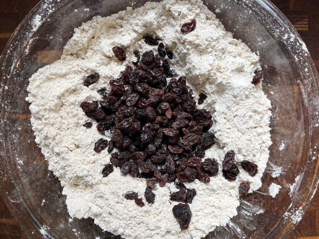 - Use your hands or a pastry cutter to work the butter into the flour mixture (it should resemble coarse breadcrumbs). Stir in the raisins.