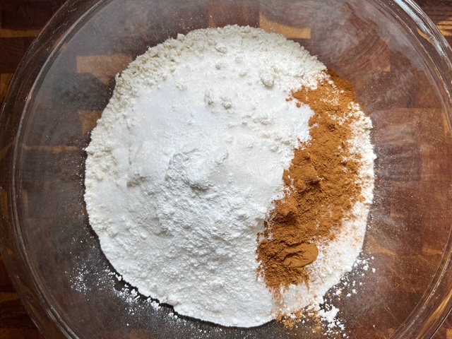 - In a large mixing bowl, whisk together the flour, sugar, salt, baking soda, baking powder, and cinnamon.