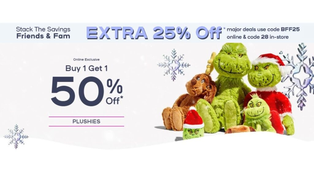 Click over to the Claire’s Friends & Family event to grab Squishmallows at Buy 1 Get 1 50% off, plus take 25% off sitewide!
