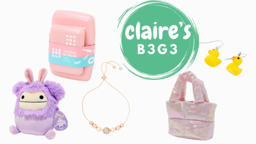 Right now, get Claire’s B3G3! This offer includes backpacks, Squishmallows, hair accessories, jewelry, and more. Get thousands of different items at this discount!