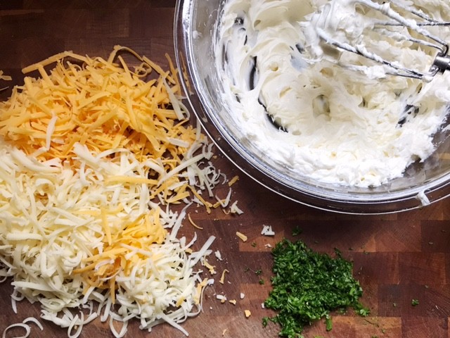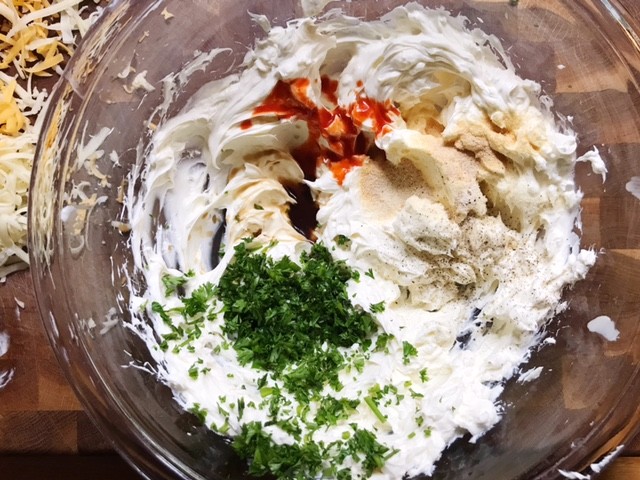 - Add in the chives, parsley, Worcestershire, hot sauce, garlic powder, onion powder, and salt and pepper. Mix on low until well combined.