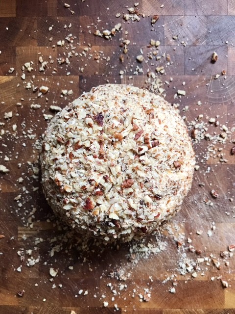 - Remove the ball from the plastic wrap. Spread the pecans on a plate and roll the cheese ball until fully coated.