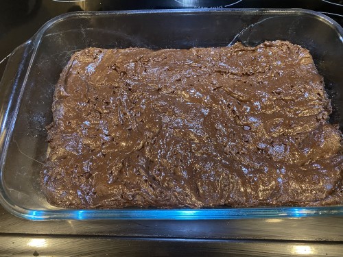 I didn’t have any brownie mix, so I made cake mix brownies. All you need is a box of any flavor cake mix, 2 eggs, and 1/3 cup vegetable oil to turn it into brownies.