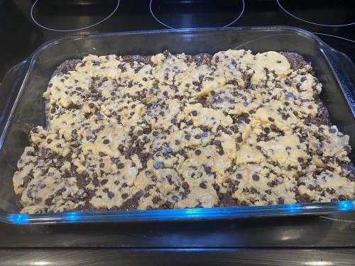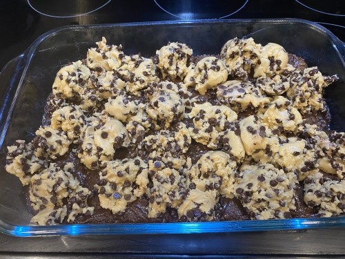 - Then use a large spoon to drop ball fulls of the cookie dough on top of the brownies. With the back of a spatula, gently press the cookie dough down into the brownie batter.