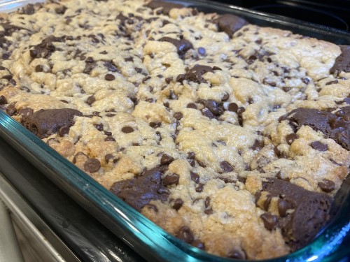 You may have seen a bagged baking mix that advertises cookie brownie bars. I’ve tried it, and they’re OK, but making your own is even easier. You can duplicate that idea on the most basic level with boxed brownie mix and bagged cookie mix. For these cookie brownie bars, I split the difference based on what I had in my pantry!