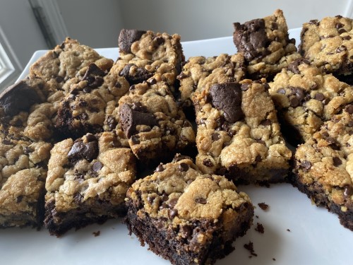 These bars are basically a layer of brownies with cookie dough pressed in. They are a great combination of flavors and only take a few minutes to put together!