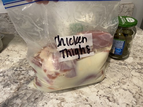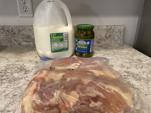 I had this chicken thawed in a ziploc bag in the freezer, so I just poured the milk and pickle juice in and let it sit in the fridge for about an hour.