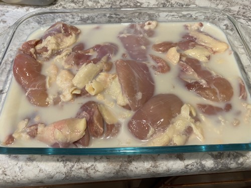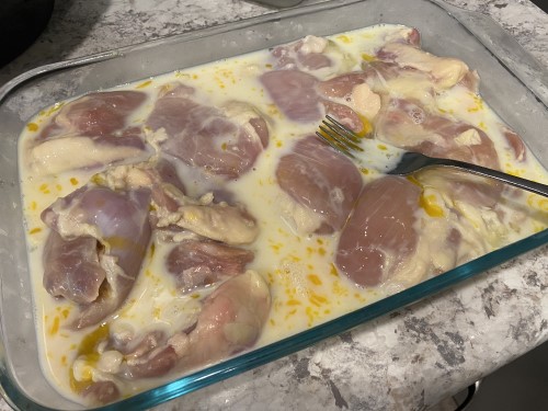 - Pour the milk/egg mixture over the chicken and make sure all of the chicken is coated.