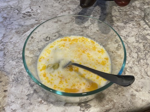 - In a separate bowl, whisk together the remaining 1 cup milk and 2 eggs.