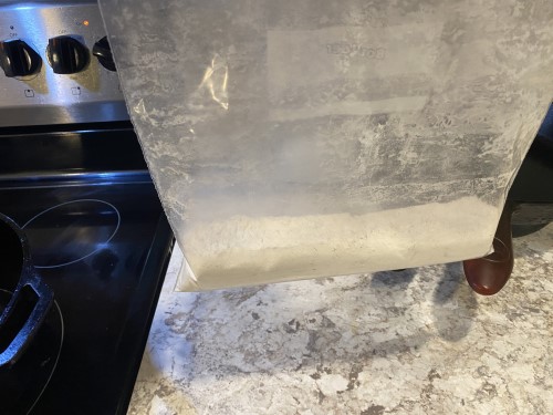- Place the flour, salt, pepper, and sugar in a large ziptop bag and mix it around.