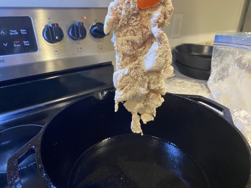 - While the oil is heating up, drain the milk/pickle juice off the chicken.