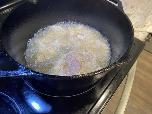 - When you're ready to cook the chicken, heat 1-2 cups oil in a deep pot over medium-high heat.