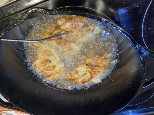 - Use a meat thermometer to ensure the chicken is cooked! You'll cook each piece for about 5-7 minutes on each side. If the breading is getting brown too fast, turn the heat down a bit.