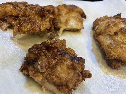 - Place the cooked chicken on a paper-towel lined plate. Continue the process until all the chicken is cooked.