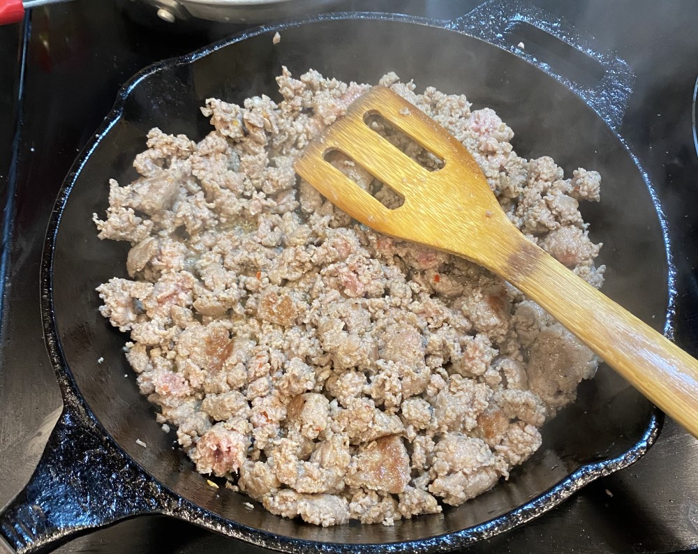 I have the eggs, sausage, and hashbrowns going at the same time, but I’m laying out the recipe with you cooking one thing at a time.