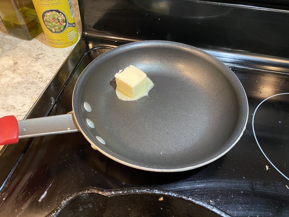 In one skillet, heat butter while you whisk together the eggs (1-2 per person) and add salt and pepper.