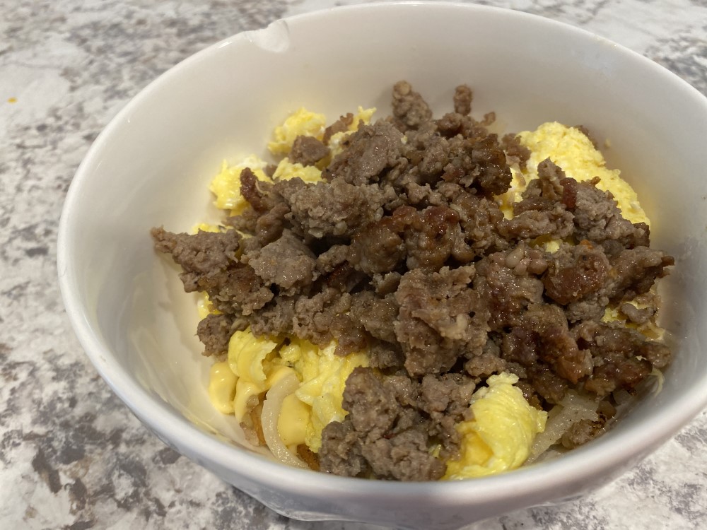 Once you’re done with all the hashbrowns, assemble the bowls: First the hashbrowns with cheese, then the eggs, then the sausage. Add hot sauce or other condiments like ketchup if so inclined!