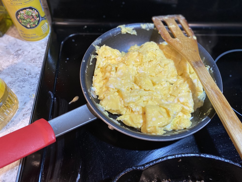 Once the butter is melted, scramble the eggs over medium-low heat.