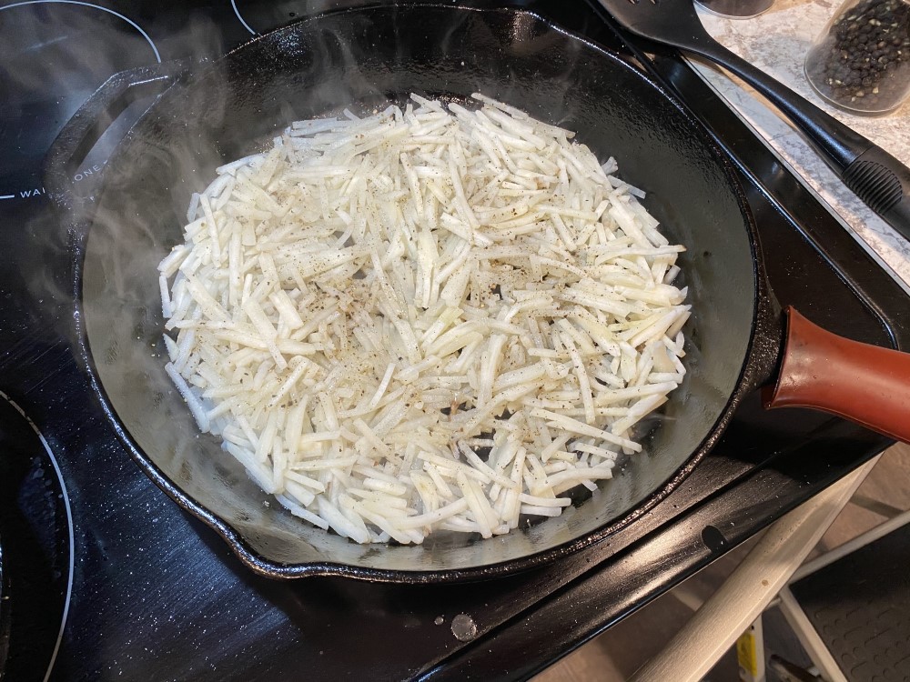 - Spread a layer of hashbrowns in the pan and cook for about 3-4 minutes without stirring. Season with lots of salt and pepper.