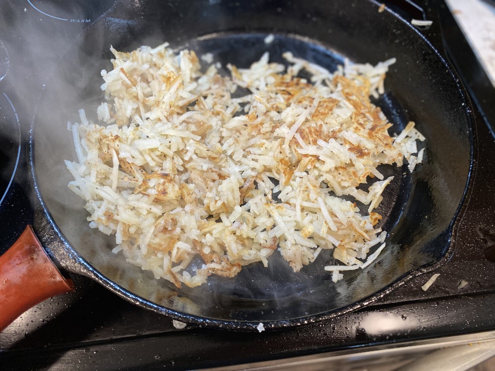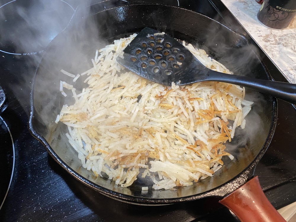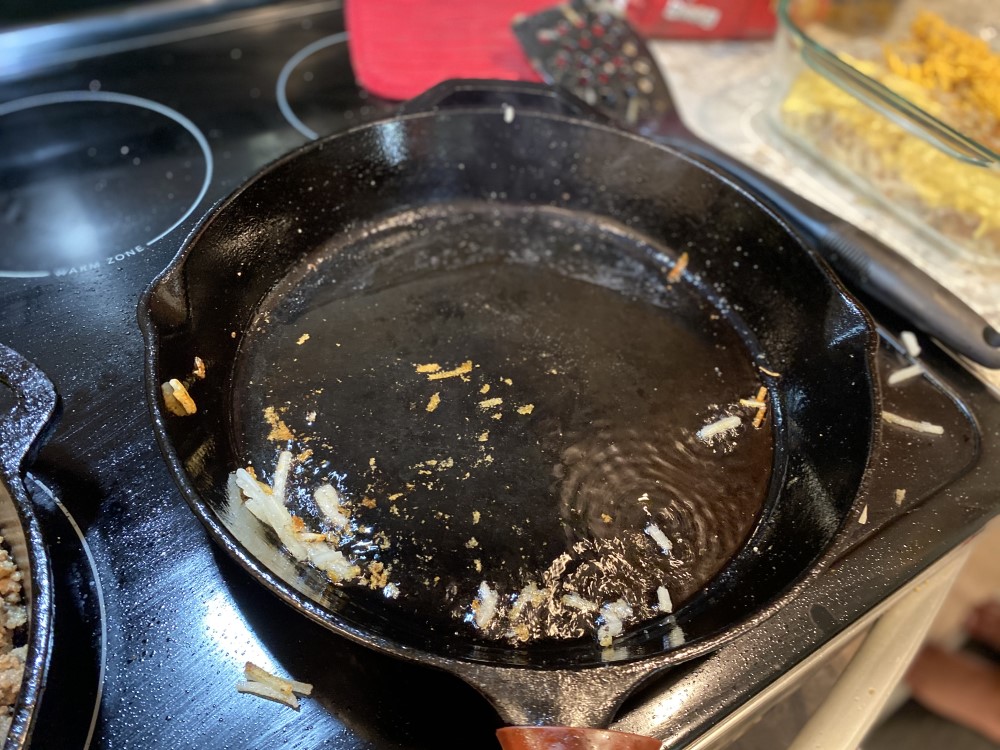 Then put the pan in the oven and let the cheese melt while you continue cooking the rest of the hashbrowns (it usually takes me 3 batches).