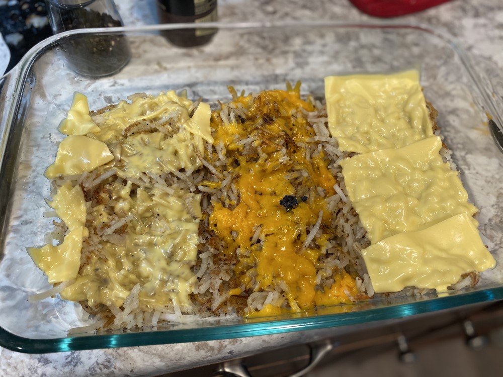 When the hashbrowns are done, scoop them out and place them in the bottom of a 13×9 pan and place slices of American cheese on top.