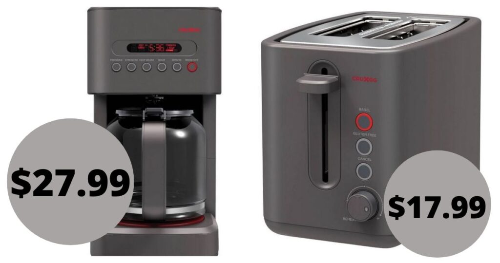 This coffee maker is available in two colors and has programmable settings. If you need a toaster, you can get the CRUXGG 2-Slice Toaster for $17.99.