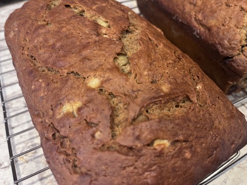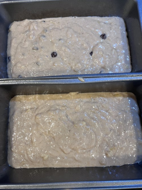 - Grease 2 loaf pans and divide the batter evenly between the two pans.
