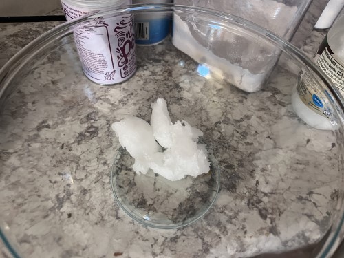 First you’ll want to get your coconut oil melted, because it’s solid at room temperature. In the South it’s still pretty warm, but not warm enough to keep the oil melted, so I zapped it in the microwave for a few seconds.
