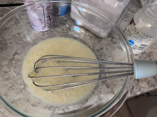 - Melt the coconut oil and mix with the eggs and the almond milk. Whisk to combine.