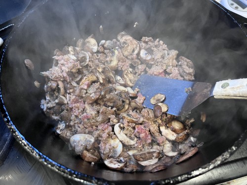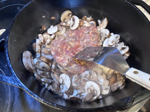 First you’ll saute the mushrooms and sausage together.