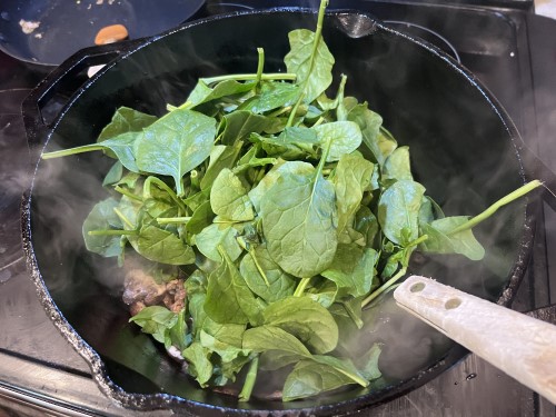 - Add the spinach and continue to cook until the spinach is wilted.