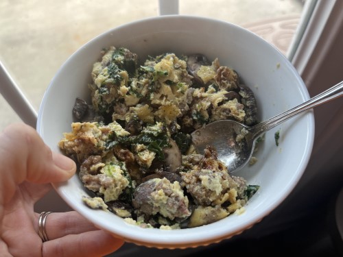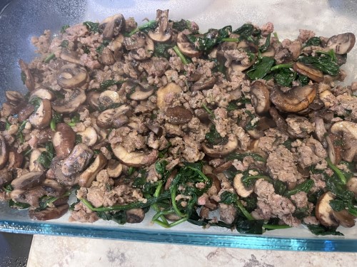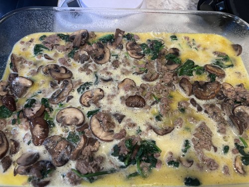 You’ll need a pound of breakfast sausage, mushrooms, spinach, and eggs. If you don’t like those veggies, choose something else!