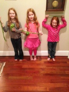 Finger knitting makes great garland for the fireplace or for the tree. My girls wanted to decorate their headboards with the garland, but 2/3 of them ended up making snakes – not quite the length of garland. Seriously, this is so easy to do, it just takes a while if you don’t use a thick yarn. Actual quote from my 9-year-old, “Wow! This is so easy.”