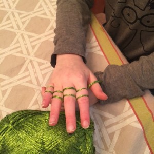 3. Pull from the skein and weave the yarn “over, under” each of your 4 remaining fingers until there are 2 “loops” on each finger with your palm face up. Loop all of the yarn fairly loosely, it will make your life a lot easier. My 6-year-old kept getting frustrated that hers was so tight.