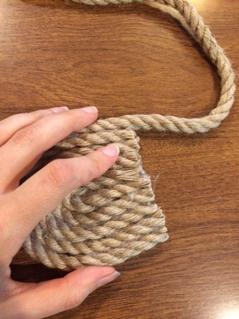 Add glue to the side of the rope and keep adding more and more layers trimming off the ends evenly. Be sure to hold each glued section as you go to ensure it will stay put.