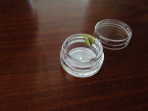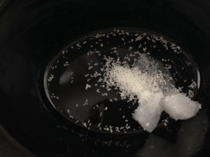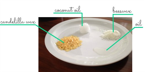 Go ahead and heat your crockpot while you’re getting the ingredients together. Dump in the coconut oil, beeswax or candelilla and the optional vitamin E. Let all of those completely melt (the photo below shows the beeswax recipe being used). If you use a tables spoon to measure, it should yield about 3 containers that measure 1.25 in. diameter.