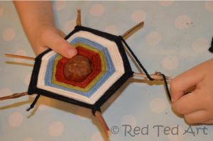 The first craft I saw was stick weaving from Red Ted Art. I know that this craft has been around for a while, but I always forget about it when I’m trying to think of crafts to do. You start with 6 sticks (or however many you want), a chestnut and some string. evenly distribute the sticks in the chestnut and keep the chestnut in the center. Take the stick around to each stick and loop it around the stick when you get to it. Continue this over and over again switching the colors when you feel like it.