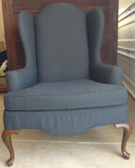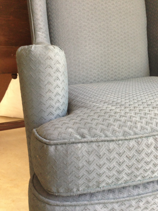 Recently I bought this chair from a a local online auction for only $25, but I wasn’t really into the fabric that came on it. The fabric kind of reminded me of what they cover the comfy waiting room chairs in at the doctor’s office. What you can’t see from the picture above is the pattern in the green fabric. They were little designs in a different color that were subtle, but raised up.
